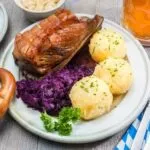 Традиционные немецкие основные блюда: жареный молочный поросенок, кнедлики, капустный салат, соус из темного пива и лука